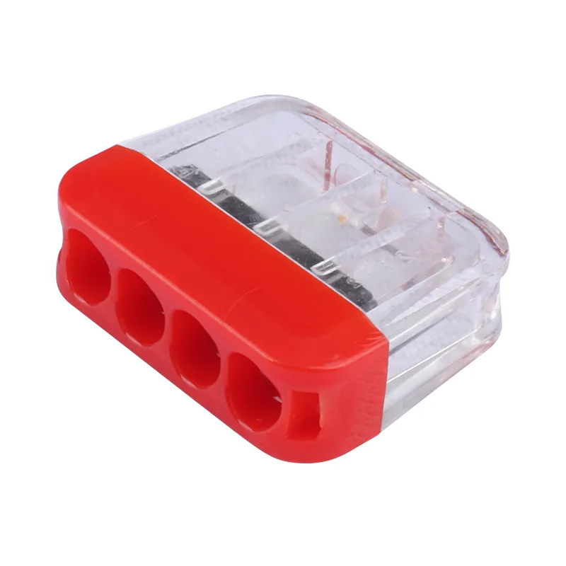 Konektor Cepat Kawat Feed-through CHTAR 2P 3P 4P 5P 6P 8P tanpa tuas terbuat dari bahan housing PC kelas UL94 V0, Konduktif terbuat dari tembaga T2 dengan berlapis Timah dan pegas terbuat dari S301. Ini dapat dihubungkan dengan kabel kaku 0,5-2,5mm2, ini menyediakan jumlah lubang yang berbeda untuk pemilihan jumlah kabel yang berbeda. Ini dapat dihubungkan dengan baik dengan 2 kabel hingga 8 kabel. Kita dapat membuat warna atau perumahan yang berbeda untuk dipilih pelanggan.